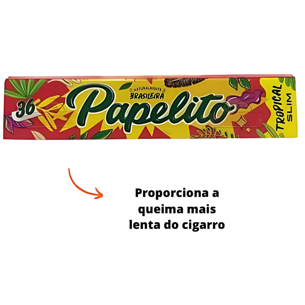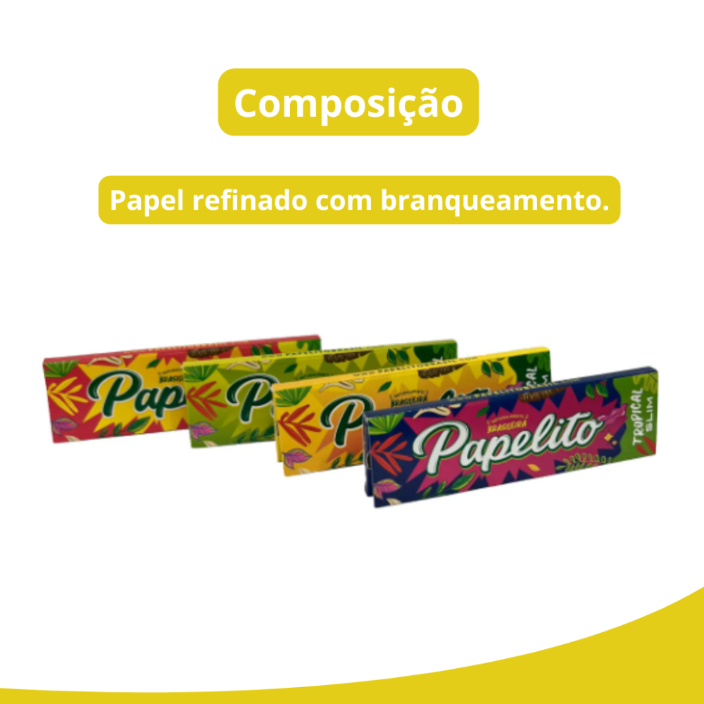 Produzida em celulose, a linha Tropical utiliza goma natural para fixação e conta com marca d’água Papelito, contribuindo para padronização do material e identificação do papel. A proposta do formato slim é entregar uma largura reduzida, mantendo o manuseio firme e a dobra uniforme ao longo da folha.