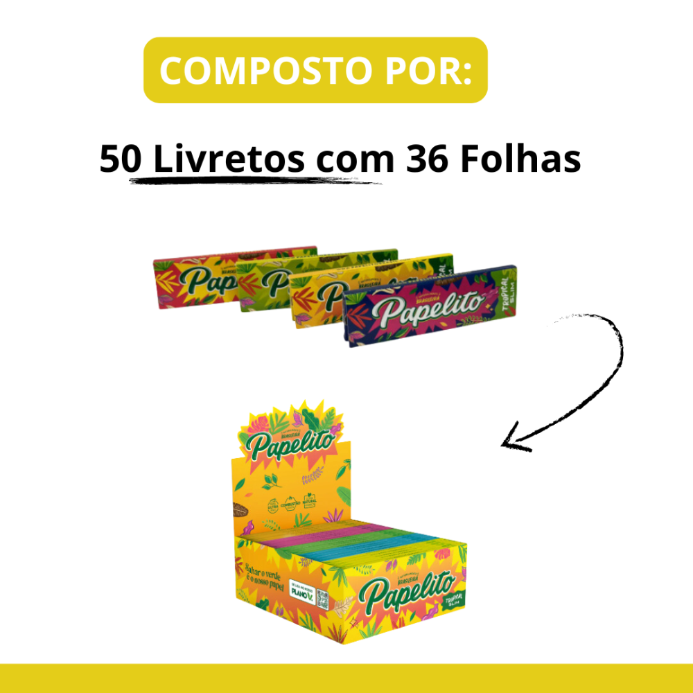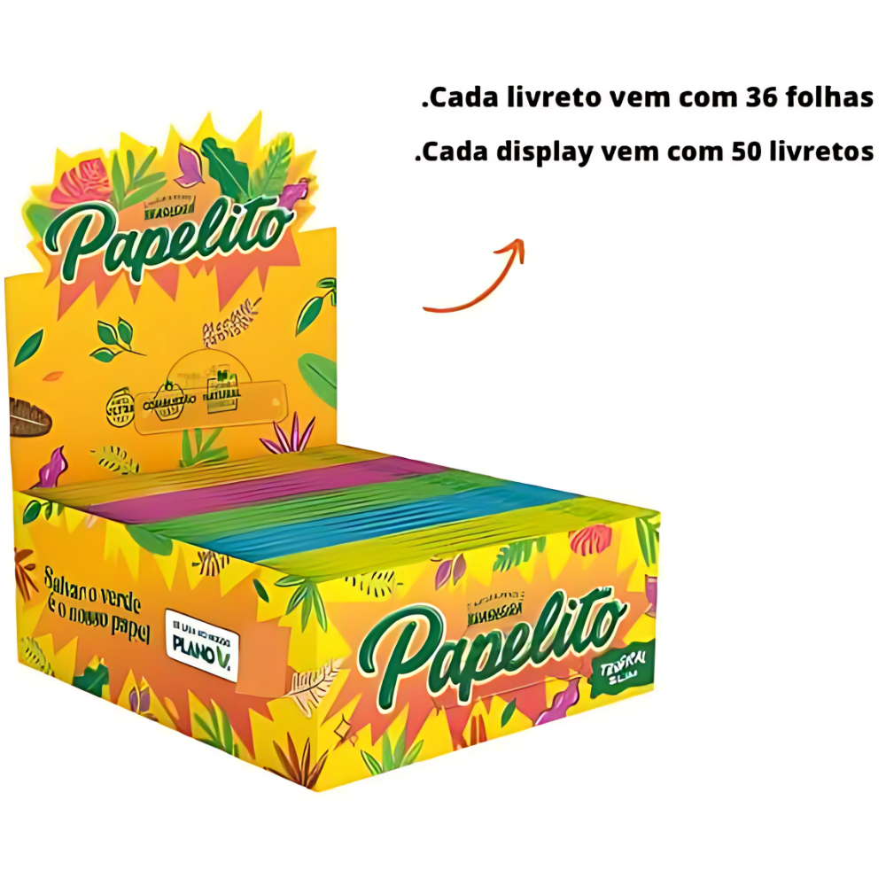 Display com 50 livretos de papel ultrafino Papelito Tropical Slim King Size (108 x 36 mm), 36 folhas por livreto, goma natural e marca d’água.
