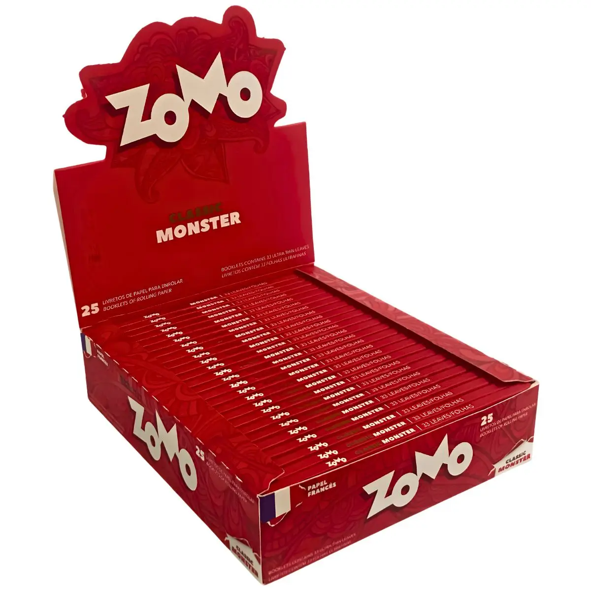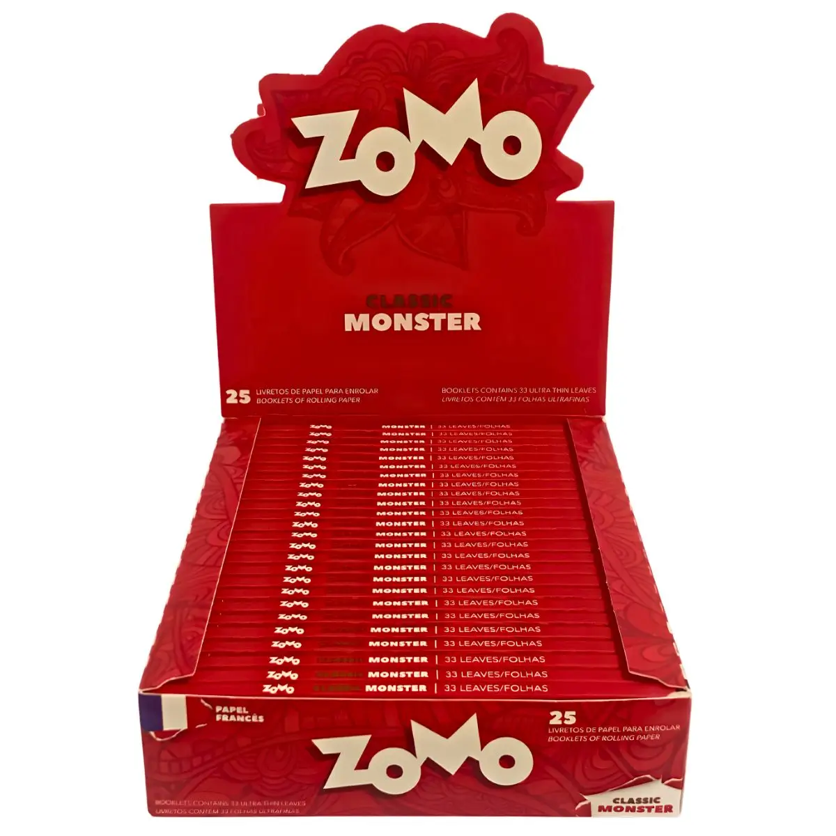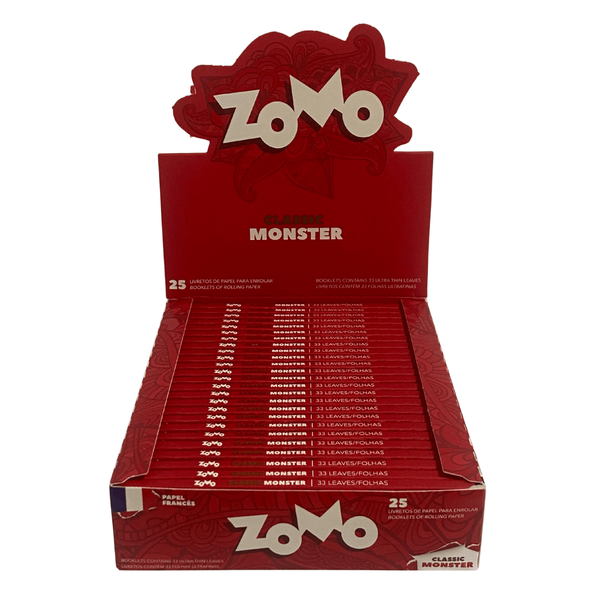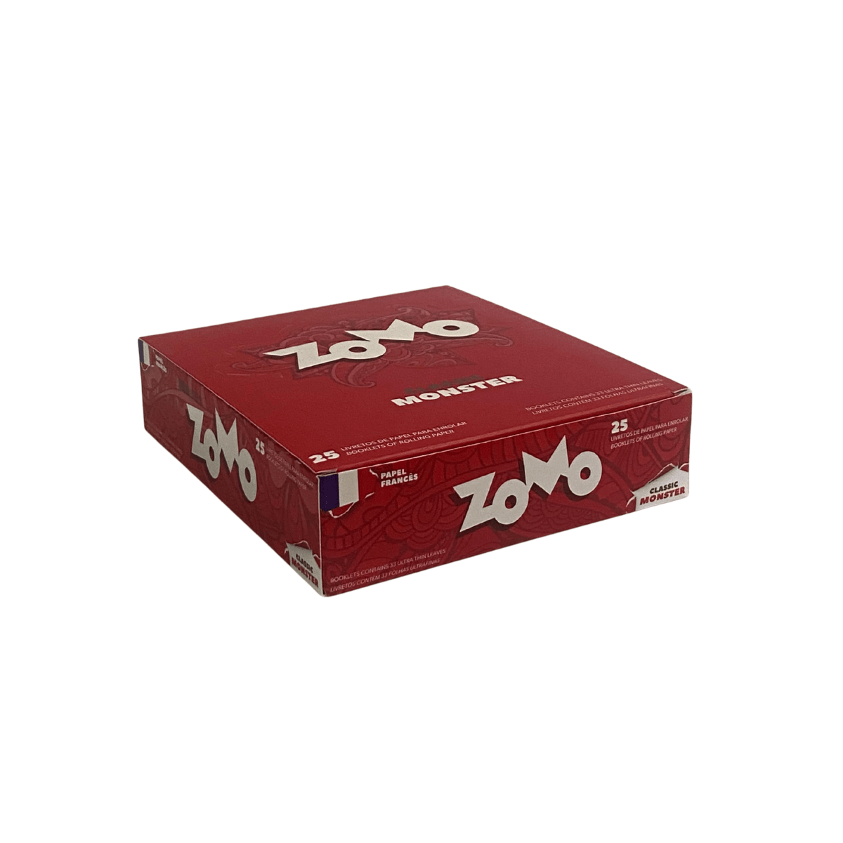 Display com 25 livretos de seda Zomo Monster Vermelha, formato King Size extra largo, papel branco ultrafino com goma vegetal, cada livreto com 33 folhas