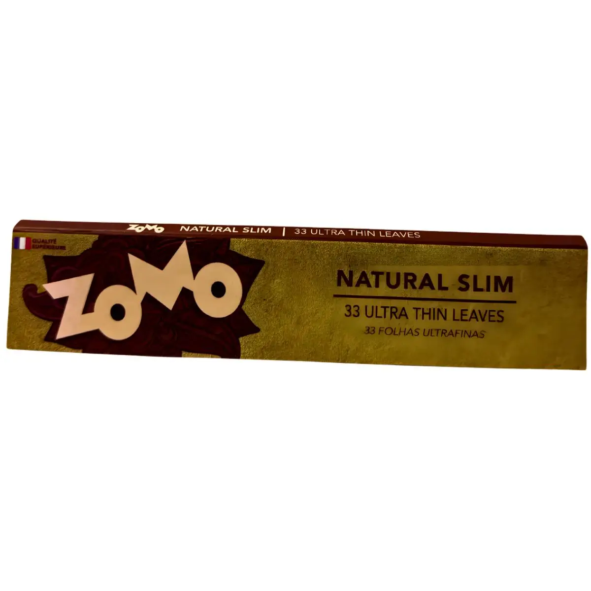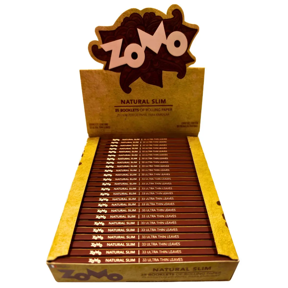 Papel de seda slim natural Zomo, ultrafino e não branqueado, display com 25 livretos de 33 folhas cada, com goma vegetal para fácil enrolamento e corte preciso.