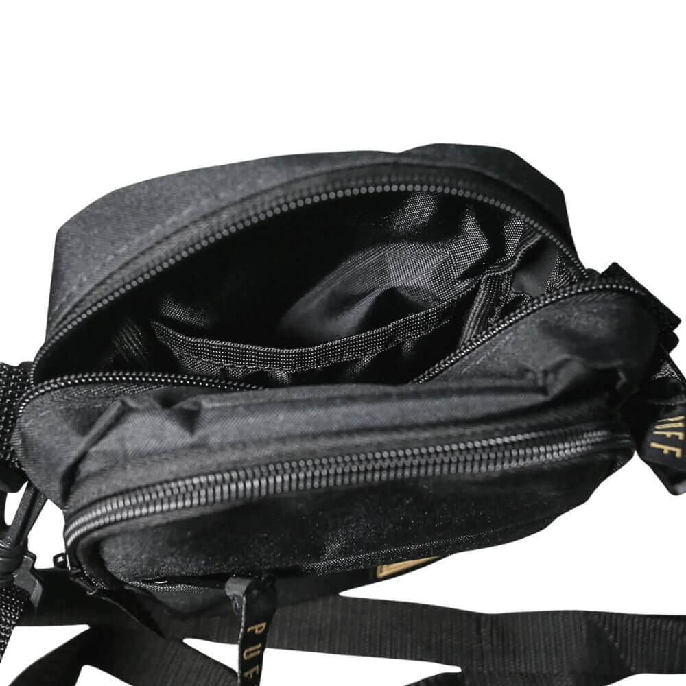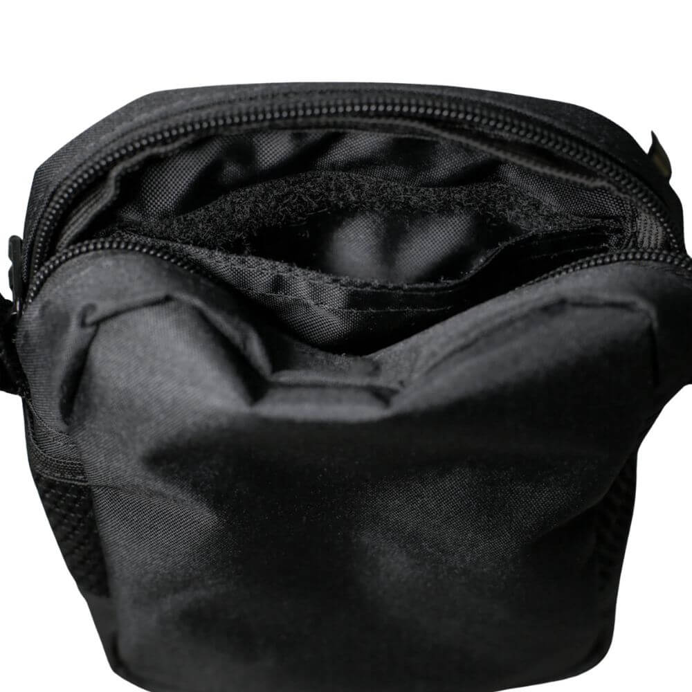 Bolsa tiracolo preta com 4 compartimentos internos, bolsos laterais, fechamento em velcro e alça regulável, indicada para organizar e transportar itens essenciais no dia a dia.