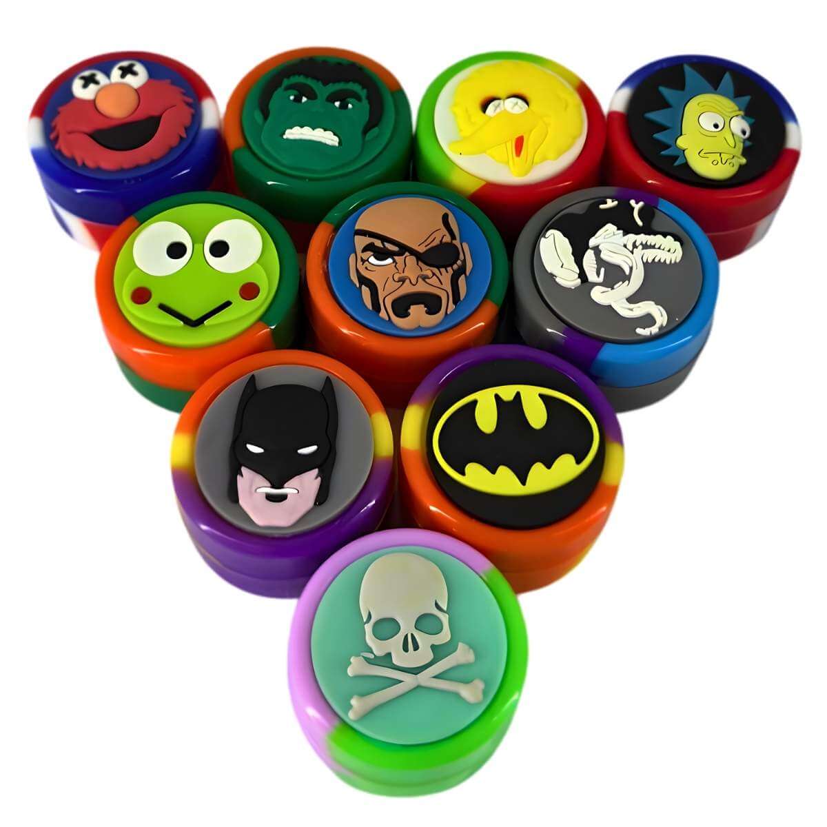 Recipientes multiuso em silicone com estampas de personagens, pacote com 10 unidades sortidas, indicados para organização de pequenos objetos em uso pessoal ou profissional.