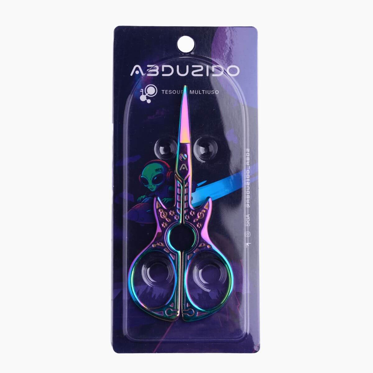 A tesoura possui corpo e lâminas em material metálico, com cabo em formato de guitarra e acabamento multicolorido tipo “rainbow”. Essa construção garante boa durabilidade para uso diário, mantendo o apelo visual característico da linha Abduzido.