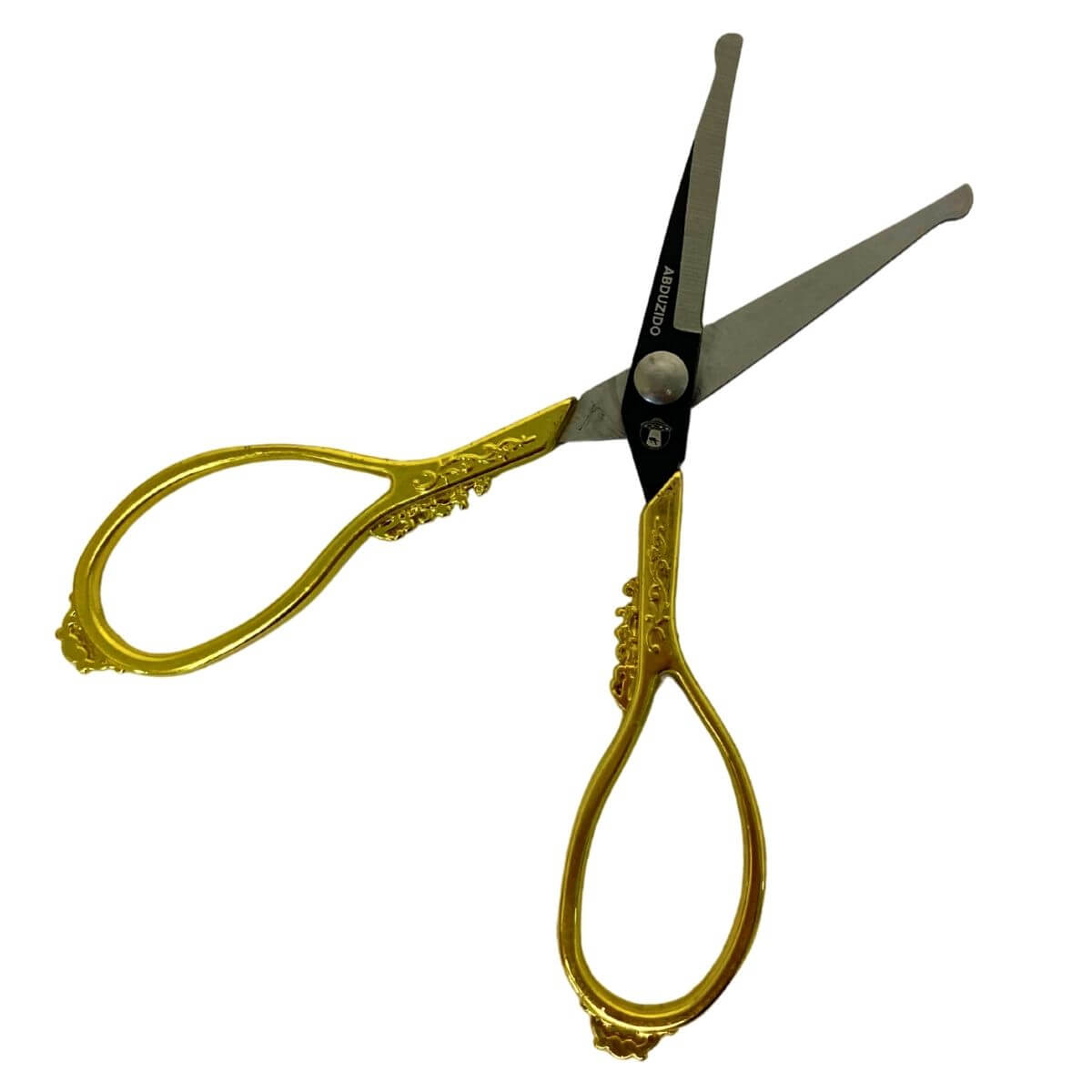Tesoura compacta em metal, aproximadamente 11 cm, com lâminas de aço, ponta arredondada e empunhadura ergonômica. Acabamento Gold/Black para cortes precisos no dia a dia.