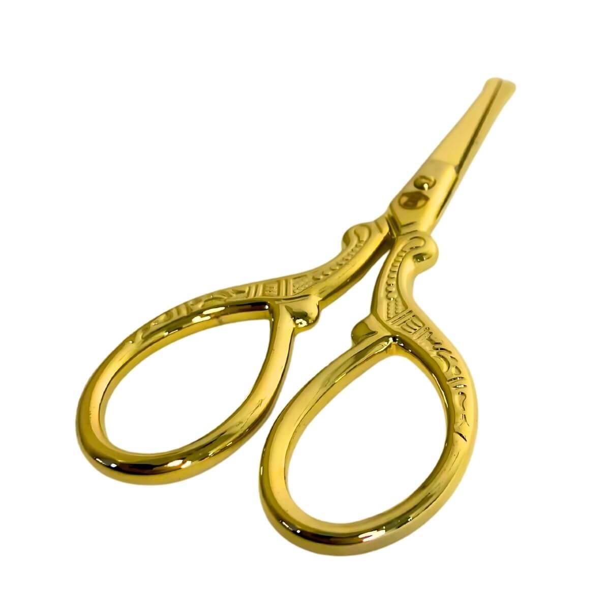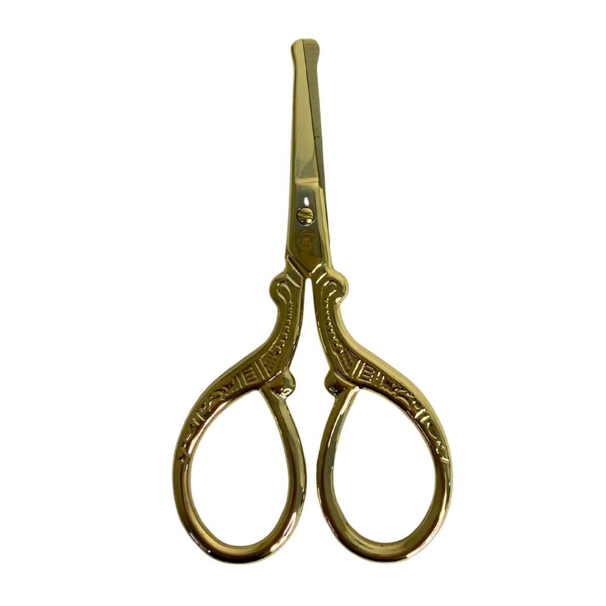 Tesoura compacta em aço inoxidável com acabamento dourado, pontas arredondadas e lâminas de corte preciso. Indicada para recortes e aparos de materiais leves.