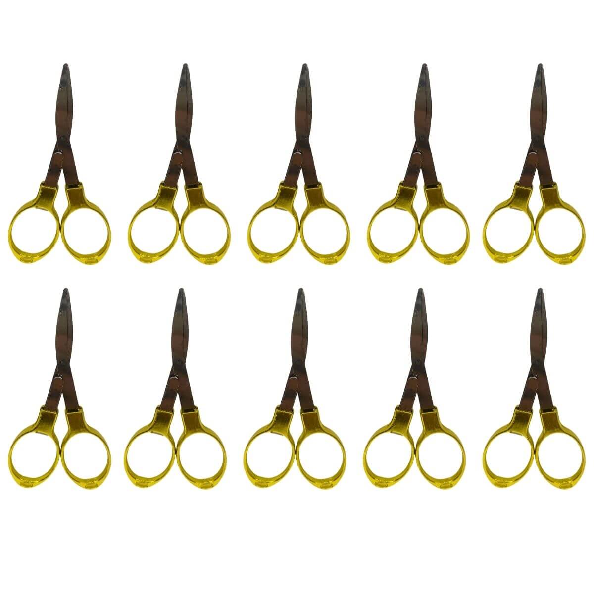 Tesoura dobrável em metal com acabamento dourado. Formato compacto para corte leve e transporte. Kit com 10 unidades, cada uma com mecanismo de dobra.