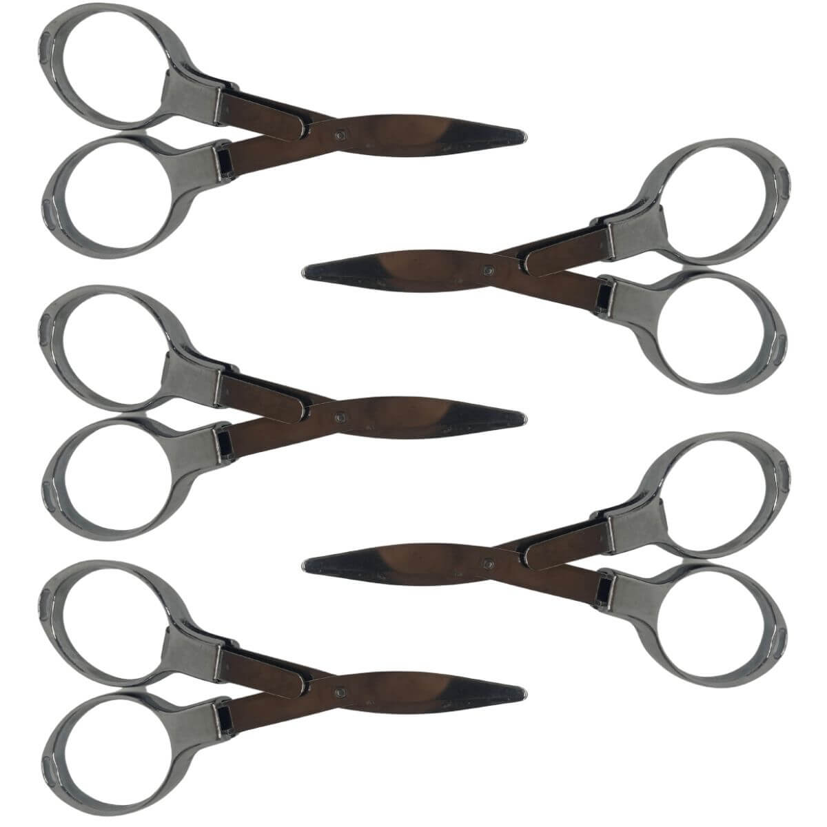 Tesoura dobrável em metal na cor prata, compacta para transporte e armazenamento. Kit com 5 unidades, indicada para cortes leves do dia a dia e uso em estojo ou nécessaire.