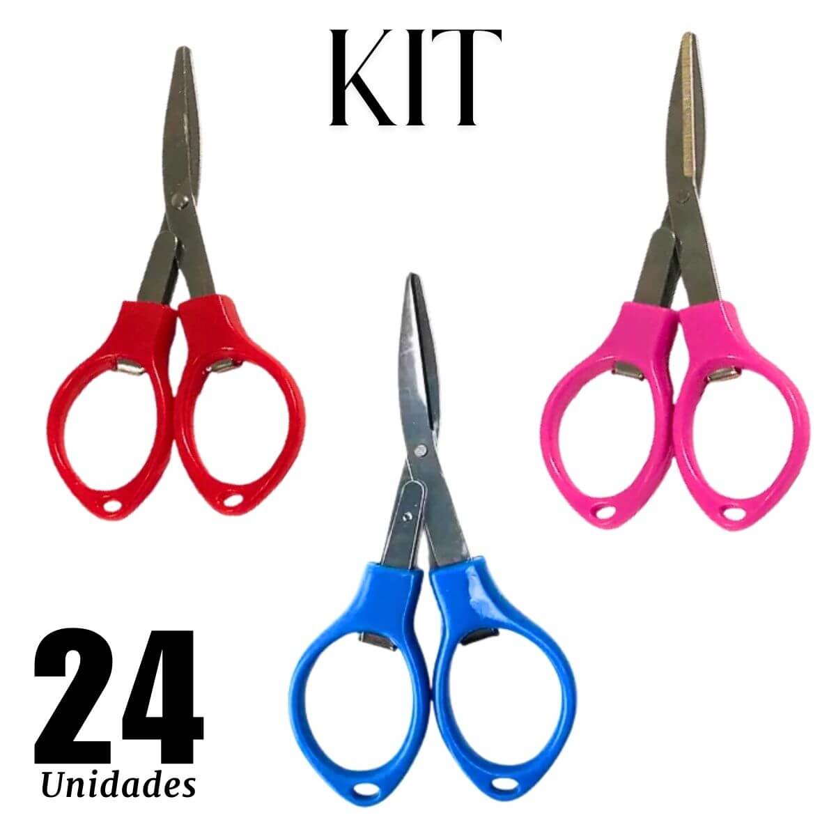 24 (vinte e quatro) tesouras de plástico dobráveis, em cores sortidas (azul, rosa e vermelha), acondicionadas em embalagem do kit.