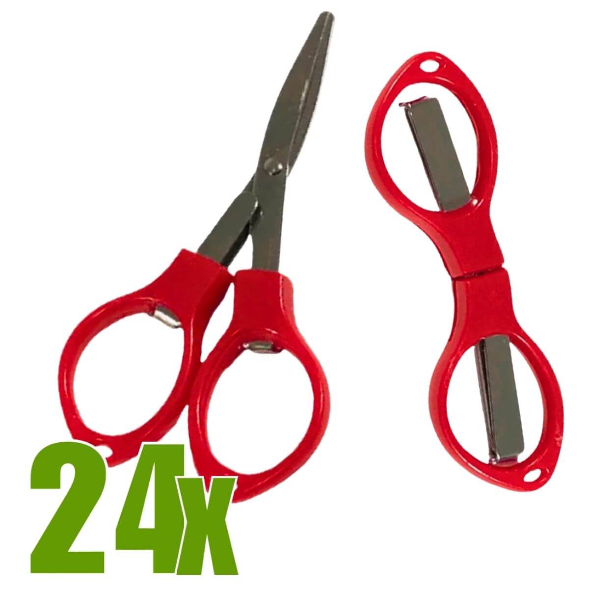 Tesoura de plástico dobrável vermelha, compacta, leve e portátil, em pacote com 24 unidades para uso cotidiano em cortes simples e organização de acessórios.