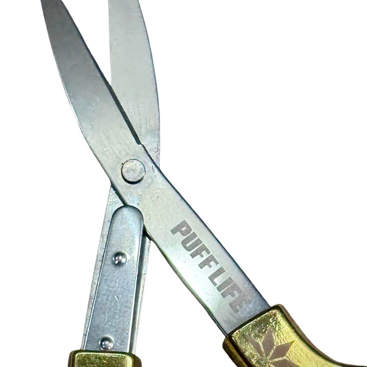 Tesoura Puff Life em aço inox com acabamento dourado, design compacto e leve, lâminas afiadas e pontas precisas, ideal para cortes rápidos em acessórios e materiais do dia a dia.