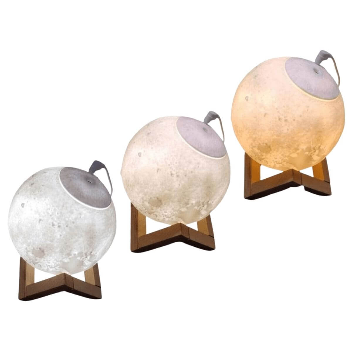 O Umidificador Aromatizador Abajur Lua Cheia 3D KP-UM04 é um dispositivo multifunção que combina umidificação ultrassônica, difusão de fragrância e iluminação decorativa em formato de lua, com acabamento em impressão 3D e base de apoio em madeira.
